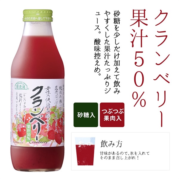 少し甘みを加え果肉たっぷりに仕上げた50%果汁クランベリージュースです。