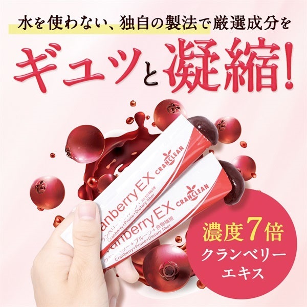 856mgのキナ酸が毎日のすっきりをサポート。たっぷりキナ酸の秘密は7倍濃度のクランベリー濃縮エキスを使用しているから。